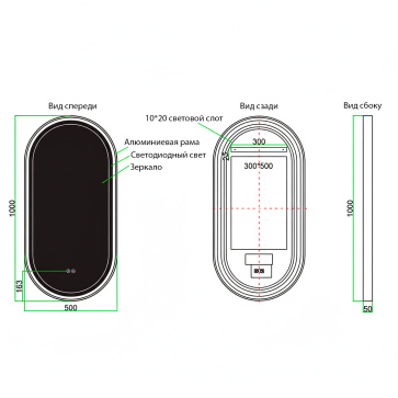 Зеркало Azario Блейк 500х1000, овальное, с подсветкой и диммером, 3 режима, сенсорный выключатель, с подогревом, черный матовый (АZ-LED011125)